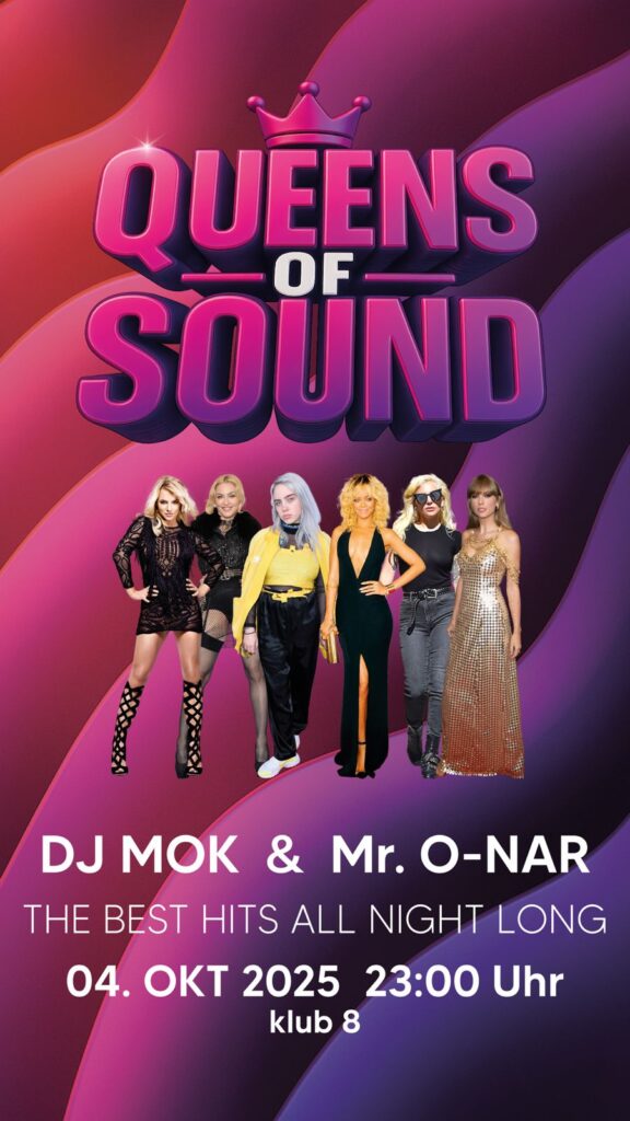 Ob Queen, King oder einfach nur Partypeople – bei uns regiert die Musik, und ihr seid das Herzstück dieser Nacht. Erwartet pure Vibes, volle Energie und die einzigartige Queens of Sound Stimmung, für die diese Party so bekannt ist.