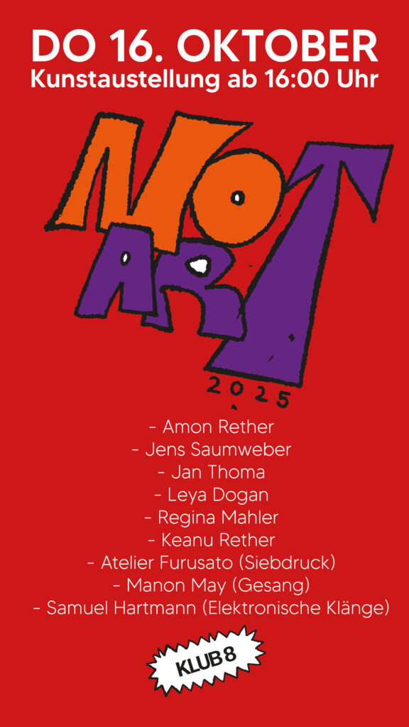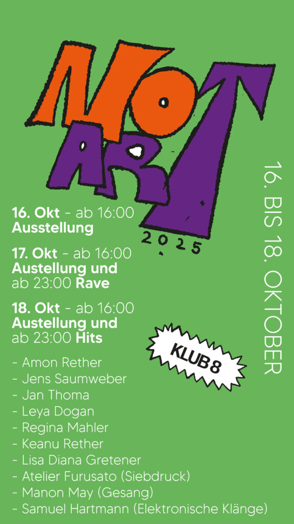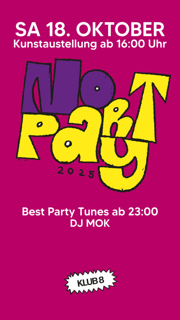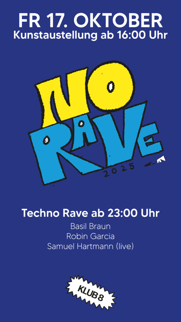 Vom 16. bis 18. Oktober verwandelt sich der klub 8 in Schaffhausen in einen kreativen Treffpunkt aus Kunst, Musik und Nachtleben. Die No Art bringt lokale Künstlerinnen und Künstler zusammen und verbindet Ausstellung, Performance und Party auf einzigartige Weise.