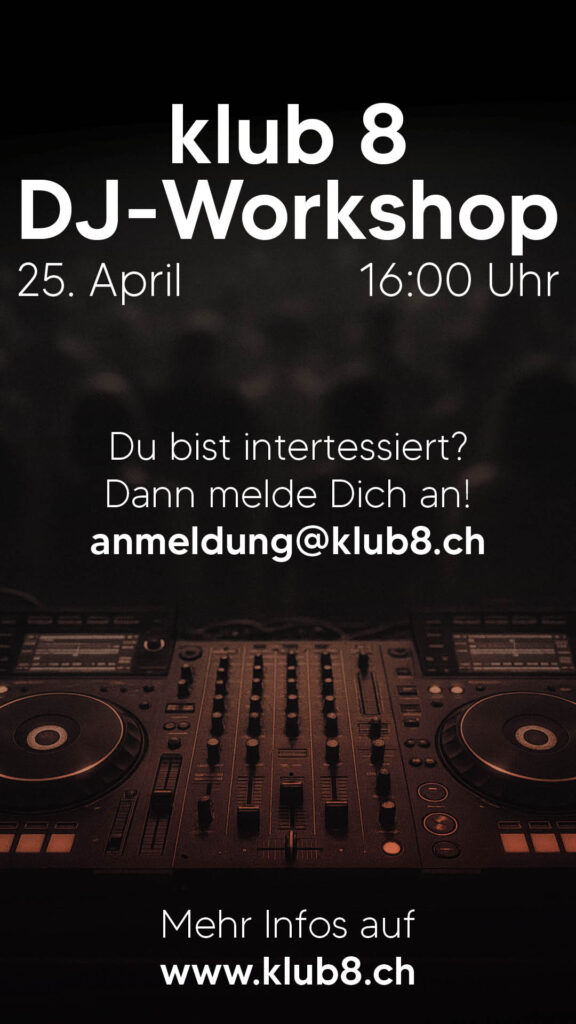 Du möchtest DJing lernen oder deine Skills aufs nächste Level bringen? Unser monatlicher DJ-Workshop im klub 8 richtet sich an Anfänger:innen genauso wie an Fortgeschrittene. Egal ob erste Mix-Versuche, Technik-Know-how oder Feinschliff fürs Set – hier bekommst du Praxis, Feedback und Austausch in entspannter klub-Atmosphäre.